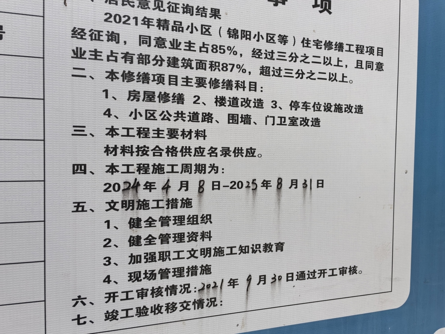 记者在小区里,找到了两张施工铭牌。一张是“精品小区”工程的,显示施工方为“金鹿建设”,竣工日期为今年8月31日。有居民告诉记者,“精品小区”的施工铭牌上竣工日期是手写的,此前写的是6月底,现在的日期已是擦除涂改,延期后的结果了。另一张是“街坊供水管网改造工程”,铭牌显示由城投集团供水分公司建设,竣工日期也是8月31日。