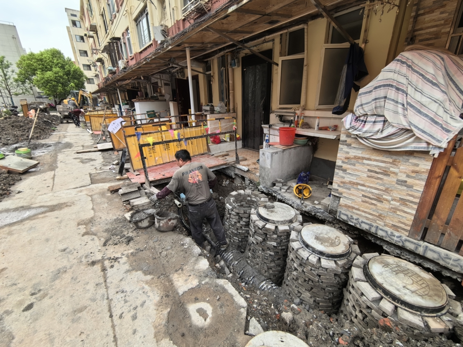 在小区东南角两排居民楼北侧,紧张的施工仍在进行中:整条通道都被挖开,挖机正忙着将堆在一旁的水泥块和渣土铲至运送建筑垃圾的三轮车内,工人们则在挖开的沟渠里俯身忙碌,用砖块砌出一个个连通排水管的窨井;不远处另一条通道里,路面被挖出一个个方形的坑,里面是蓝色的自来水阀门,周围则围起黄色的施工围挡。记者从工人们口中得知,有两队人马同时在施工,施工内容分别是雨污水分流和供水管网改造工程。施工完成后,会用水泥对开挖处进行临时修复,这解释了小区路面坑洼和遍地井盖的由来。